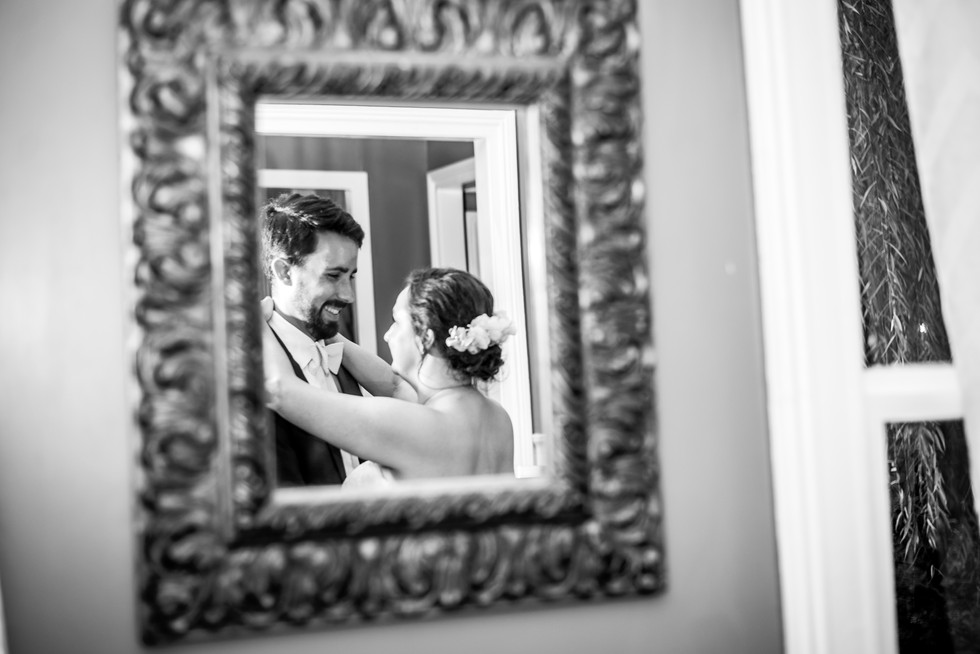 The part that sticks out the most about their wedding day happened when they got to the reception venue. Dinner was waiting for them in the house, away from all of the guests. Her sister and brother-in-law were there and were trying to bustle her dress so she could sit and eat. It finally got figured out so they could both enjoy their dinner.